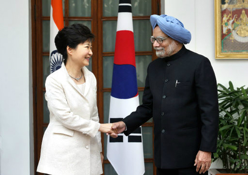 인도를 국빈 방문 중인 박근혜 대통령은 16일(현지시간) 뉴델리 대통령궁 영빈관에서 만모한 싱 인도 총리와 정상회담을 갖고 이 같은 내용을 골자로 한 ‘한·인도 전략적 동반자 관계 확대를 위한 공동성명’을 채택했다.