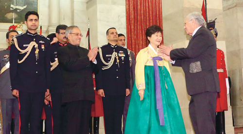 | 국빈만찬… 환영 받는 朴 대통령 인도를 국빈방문 중인 박근혜 대통령이 16일(현지 시간) 오후 수도 뉴델리의 대통령궁인 라슈트라파티에서 열린 국빈만찬에서 주최자인 프라납 무커지 인도 대통령(오른쪽 두번째) 등으로부터 박수로 환영을 받고 있다. 뉴델리=연합뉴스 |