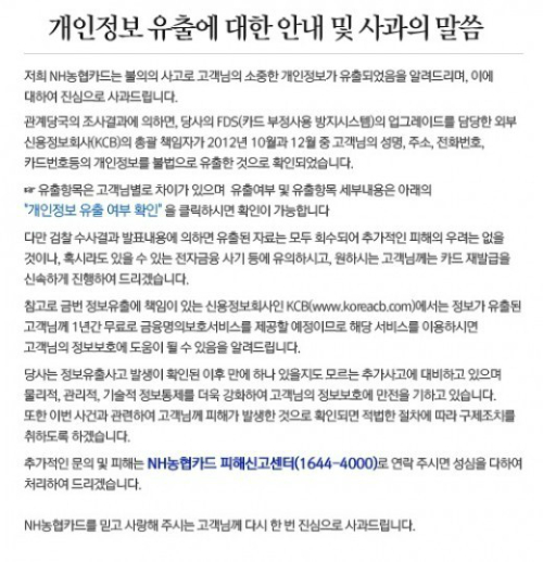 한편 카드사들은 우편·전화·이메일·휴대폰 문자메시지 등을 통해서도 고객들에게 개인정보 유출 유무에 대해 통지할 계획이다.