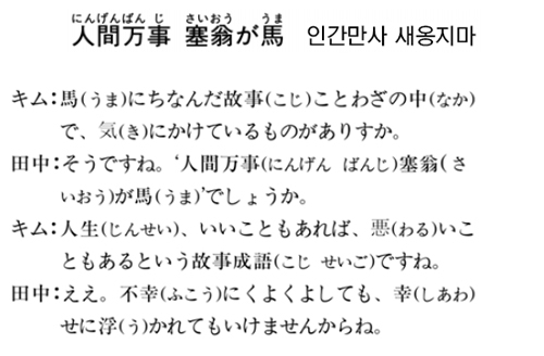 인생의 모든 일은 복이 화가 되고 화가 복이 될 수 있다는 고사성어, ‘인간만사 새옹지마’. 일본에서는 ‘人間万事(にんげん ばんじ)塞翁(さいおう)が馬(うま)’라고 한다. 뜻이 좋아서 좌우명으로 삼는 사람도 많다.