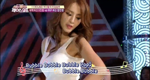 흰민소매 티셔츠와 핫팬츠를 입은 정인영 아나운서는 포미닛 현아의 ‘버블팝’’ 댄스를 선보였다. 특히 포인트 안무인 골반댄스를 완벽하게 재연해 시청자의 눈길을 사로잡았다.