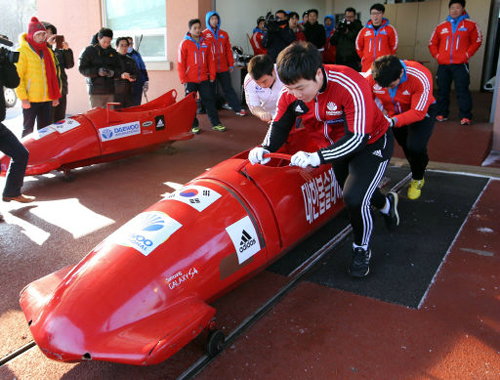 | 소치 동계올림픽에 출전하는 원윤종(앞) 등 봅슬레이 대표팀이 지난달 27일 강원 평창 알펜시아 경기장에서 훈련하는 모습. 연합뉴스 |