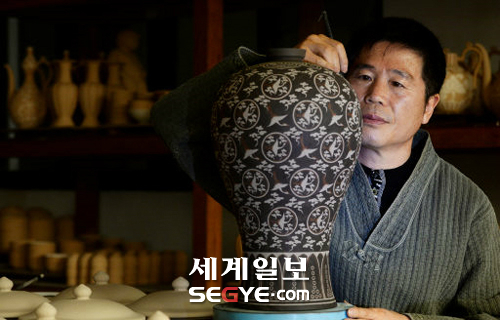 | 강진청자박물관 연구작업실에서 조유복 도예가가 세심한 조각으로 자기의 문양을 만들고 있다. |