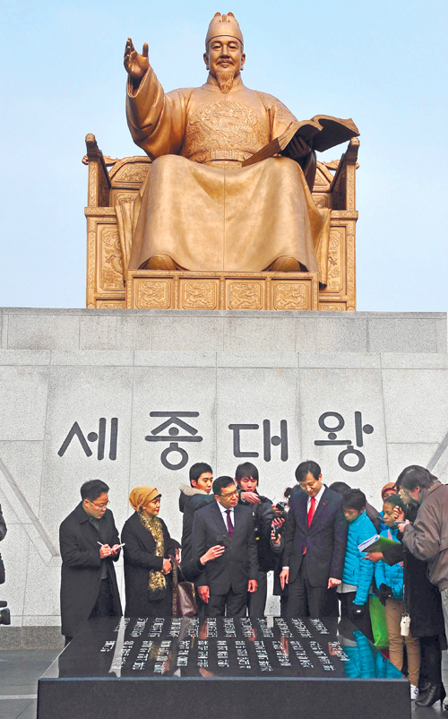 | 서울 광화문광장의 세종대왕 동상. 여섯 용 춤추는 바다의 나라 해동(海東)은 우리의 정체성이다. 세종과 집현전 학자들이 ‘훈민정음’을 창제하고, 그 기쁨을 보인 첫 번째 글이 ‘용비어천가’다. 세계일보 자료사진 |