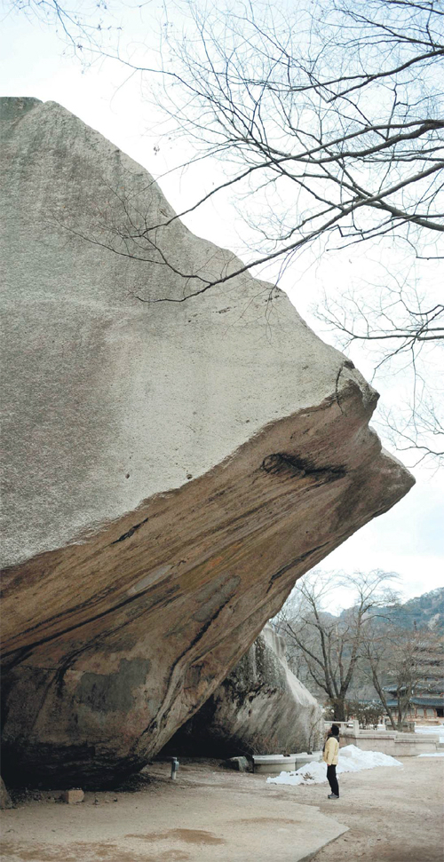 | 충북 보은의 속리산 법주사에는 익히 알려진 국보·보물 외에도 크고 높은 풍경이 여럿이다. 마름모꼴로 생긴 거대한 바위인 추래암 안쪽에는 보물 216호인 마애여래의상이 자리하고 있다. 추래암 뒤로 보이는 5층 목탑이 국보 제55호인 팔상전이다. |