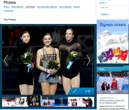 | 소치 동계올림픽 위원회 공식 홈페이지에 올려진 피겨여왕 김연아 선수(왼쪽)와 러시아 아델리나 소트니코바 선수(가운데)의 시상식 장면. |