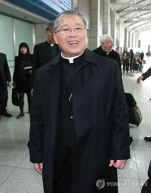 | 염수정 추기경이 로마 바티칸 성 베드로 대성당에서 열리는 서임식에 참석하기 위해 16일 오후 인천국제공항을 통해 출국하며 활짝 웃고 있다. |