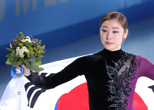 | 피겨여왕 김연아가 21일 오전 (한국시간) 러시아 소치 아이스버그 스케이팅 팰리스에서 열린 2014 소치 동계올림픽 피겨스케이팅 여자 싱글에서 러시아 아델리나 소트니코바에 이어 은메달을 획득했다. 김연아가 플라워세리머니를 마친 뒤 태극기를 몸에 감고 관중에게 인사하고 있다. <연합> |