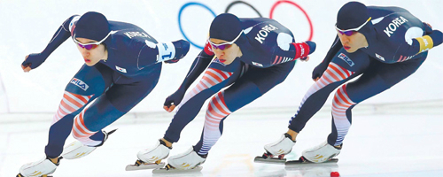 | 이승훈, 주형준, 김철민으로 구성된 한국 스피드 스케이팅 남자 팀 추월 대표팀이 23일(한국시간) 소치올림픽 팀 추월 네덜란드와의 결승에서 호흡을 맞추며 전력 질주하고 있다. 소치=연합뉴스 |