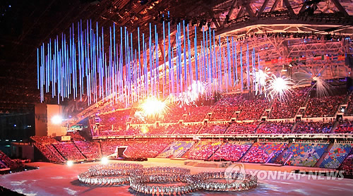 24일(한국시간) 러시아 소치 해안 클러스터의 피시트 스타디움에서 열린 대회 폐막식 첫 공연 '하늘과 바다'에서는 700명의 무용수가 오륜을 만드는 장면이 나왔다.