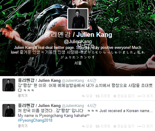 줄리엔강은 26일 오후 자신의 트위터에 “나의 한국 이름이 생겼다”며 “바로 ‘강평창’!”이라고 글을 올렸다. 그는 “Just received a Korean name, My name is Pyeongchang Kang”이라며 영어로도 글을 적었다.