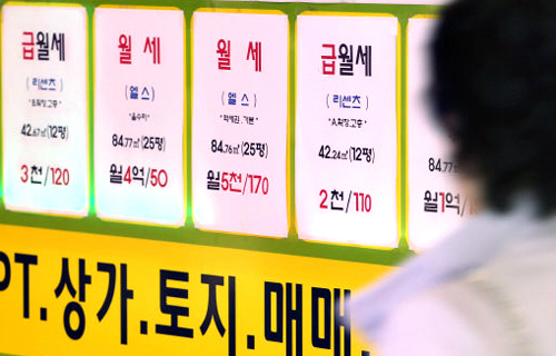 | 정부가 26일 총 급여액 7000만원 이하 근로자에 대한 월세 임대료 세제지원을 확대하는 내용의 ‘주택 임대차 시장 선진화 방안’을 발표했다. 한 시민이 서울 잠실의 부동산 중개업소에 내걸린 시세표 앞을 지나가고 있다. 연합뉴스 |