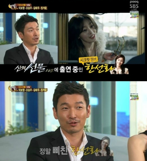 이날 방송에서 조승우는 SBS 월화드라마 ‘신의 선물-14일’에 함께 출연하는 한선화에게 미안함을 밝혀 시청자들의 눈길을 사로잡았다. 군시절 시크릿을 좋아했다며 입을 뗀 조승우는 “선화씨랑 연기한다는 게 믿기지 않았다”고 첫 촬영 당시를 떠올렸다.