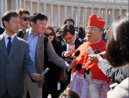 | 염수정 추기경이 추기경 서임식을 끝낸 후 바티칸 광장에서 한국 기자들의 질문에 답하고 있다. |