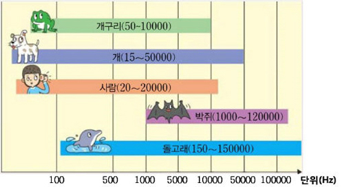 그림에서 보듯 동물이 들을 수 있는 소리의 주파수 영역은 다양하다. 사람은 20∼2만㎐의 소리를 들을 수 있는데, 이 영역의 소리를 가청 주파수라고 한다. 따라서 사람은 모기의 날갯짓 소리는 들을 수 있으나, 나비의 날갯짓 소리는 진동수가 20㎐보다 작아 들을 수 없다.