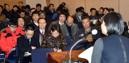 | 지난달 6일 서울 영등포구 여의도동 중소기업중앙회에서 열린 통상임금 설명회에서 중소기업 인사담당 직원들이 고용노동부 직원의 ‘통상임금 노사지도 지침’ 관련 설명을 귀담아듣고 있다. 세계일보 자료사진 |
