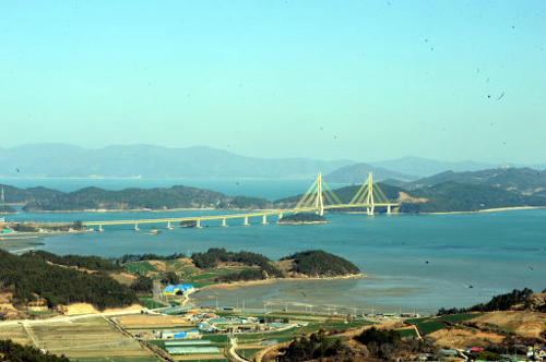 전남 고흥군의 거금도는 소록대교와 소록도를 거쳐 다시 거금대교를 딛고 들어가게 된다. 거금도에서 가장 먼저 눈길이 머무는 것은 이 다리다. 유려한 곡선을 그리는 외관부터 여간 수려한 게 아니다. 높이 168m의 주탑 두 개가 케이블로 상판을 받치고 있다. 총 연장 6.67㎞, 육상 구간을 빼면 바다를 건너는 교각 구간은 2㎞ 남짓 된다.