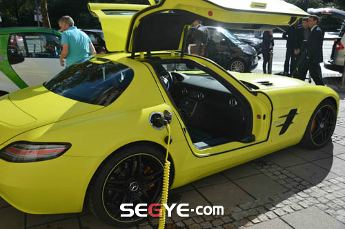 지난해 9월 독일 프랑크푸르트 모터쇼에서 공개한 이 차를 현지 언론의 취재를 위해 거리에서 충전하는 모습이 포착됐다. 메르세데스 벤츠의 전기차 SLS AMG E-CELL은 차체 앞뒤에 각각 2개씩 총 4개의 전기모터를 장착해 최고출력 526마력, 최대 토크 89.7㎏·m의 성능을 자랑한다.