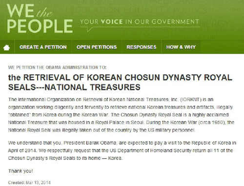 16일(현지시간) 백악관에 따르면 한국문화재환수국제기구(IORKNT)는 지난 13일 백악관 청원사이트 ‘위 더 피플(We the People)’에 올린 청원에서 “1950년 6·25전쟁 당시 미군 장병이 불법적으로 유출한 국새와 어보 등 대한제국 보물이 미국에 있다”고 지적했다.