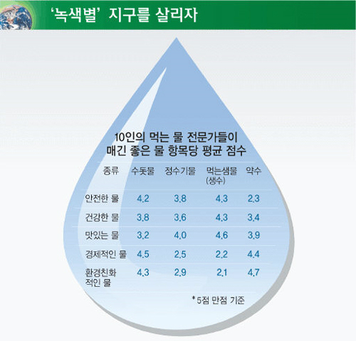 맛있는 물에서는 먹는샘물이 1위, 수돗물이 최하위였다. 경제적인 물과 환경친화적인 물 항목에서는 수돗물과 약수가 각각 4점대로 높은 점수를 받은 반면 정수기물과 먹는샘물은 나란히 2점대를 기록했다.