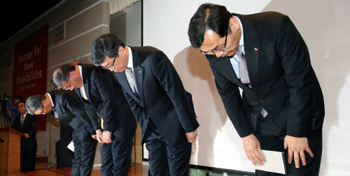 | 하성민 사장(오른쪽 두 번째)을 비롯한 SK텔레콤 임원들이 21일 서울 을지로 본사에서 전날 발생한 서비스 장애와 관련해 고개 숙여 사과하고 있다. 오른쪽부터 윤원영 마케팅 부문장, 하 사장, 박인식 사업총괄, 이종봉 네트워크 부문장. 연합뉴스 |