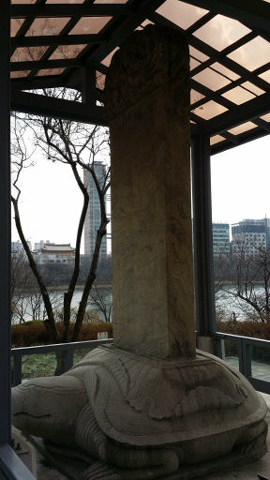 | 석촌호수 곁 쌈지공원에 서있는 삼전도비. 조선의 여인들을 강탈해 ‘환향녀’로 만든, 청나라 황제의 공덕을 칭송한다는 내용이 적혀 있는 치욕의 기록이다. |