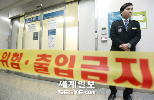 권 과장이 치료를 받고 있는 응급중환자실 주변에는 노란색 출입금지 라인이 쳐져 일반인의 접근을 막고 있었다. 병원 보안요원 4명이 주변에 배치돼 있었다.