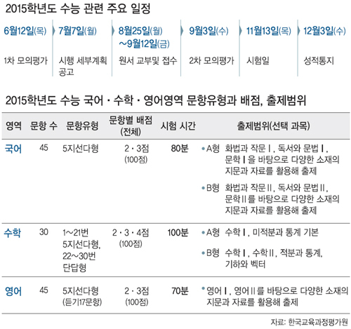 수능 출제기관인 한국교육과정평가원은 26일 이 같은 내용을 골자로 한 ‘2015학년도 수능 시행 기본계획’을 발표했다.