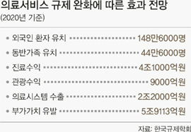 27일 한국규제학회에 따르면 한국경제연구원의 송용주 연구원과 변양규 연구위원은 규제 완화로 의료 서비스 산업이 활성화하면 2020년에는 5조9000억원 상당의 부가가치를 유발하고 11만5000개의 일자리도 창출할 수 있다고 최근 전망했다. 이들 연구원은 ‘새로운 시장 창조를 위한 의료서비스산업 규제 개선의 경제적 효과 추정’ 보고서에서 의료서비스 산업을 활성화하려면 해외 환자 유치 과정을 간소화하고 병원의 영리 추구 사업 진출, 비의료인의 병원 투자, 의료인 간 동업 허용 등 규제 완화가 필요하다고 주장했다. 이를 통해 2020년에는 외국인 환자 148만6000명, 동반가족 44만6000명 등 총 193만2000명을 유치할 수 있을 것으로 봤다. 이들을 통해 벌어들이는 진료수익은 4조1000억원, 관광수익은 9000억원에 달할 것으로 관측했다.