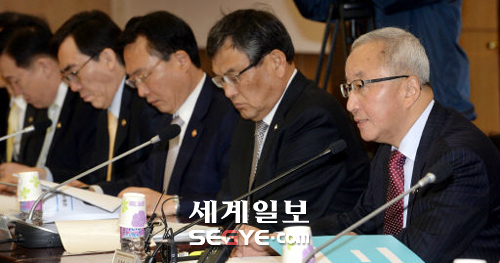 | 현부총리 “불합리한 규제는 독버섯” 현오석 부총리 겸 기획재정부 장관(맨 오른쪽)이 27일 서울 세종로 정부서울청사에서 열린 경제관계장관회의에서 “불합리한 규제는 경제의 독버섯이란 인식을 하고 규제개혁을 추진하겠다”고 밝히고 있다. 이제원 기자 |