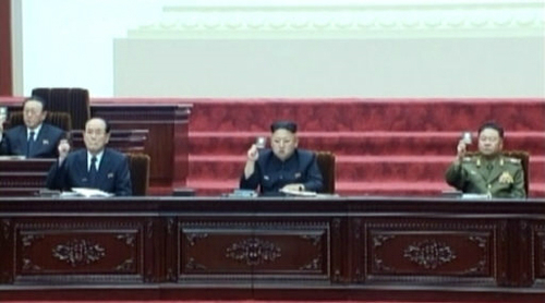 | 북한이 9일 평양 만수대 의사당에서 최고인민회의 제13기 제1차 회의를 개최한 가운데 김정은 국방위원회 제1위원장(가운데)이 당원증을 들어 보이고 있다. 왼쪽은 이번 회의에서 유임된 김영남 최고인민회의 상임위원장, 오른쪽은 국방위원회 부위원장으로 승진하며 김정은 체제 2인자 지위를 굳힌 최룡해 군 총정치국장. 조선중앙TV 화면, 연합뉴스 |