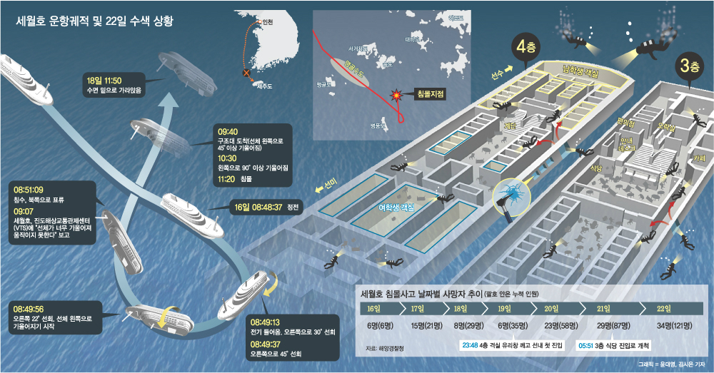 고명석 해양경찰청 장비기술국장은 “식당 옆 라운지에서 실종자를 찾아낸 뒤 다음 목표가 식당이었다”며 “라운지와 식당칸 사이에는 격벽이 있는데, 그것을 부수는 게 쉽지 않았다”고 설명했다.