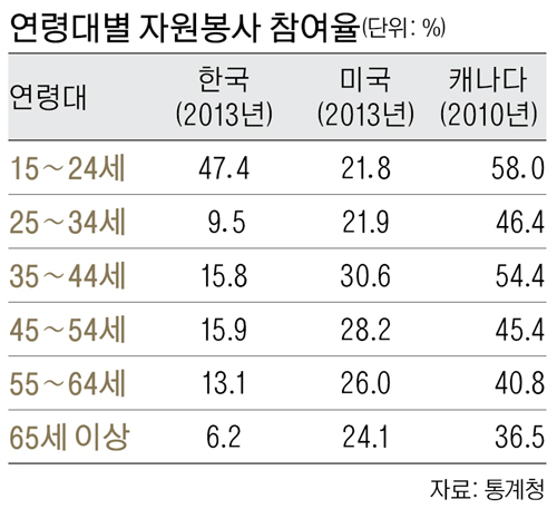 외국과 비교해보면 우리나라 자원봉사자의 특정 연령대 편중 현상이 두드러진다. 우리나라의 15∼24세 자원봉사 참여율은 47.4%로 캐나다(58%)보다는 낮았지만 미국(21.8%)보다 높았다.