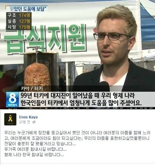 세월호 실종자 가족들을 위해 케밥 자원봉사자로 나선 터키인 에네스 카야가 위로의 메시지를 전했다.