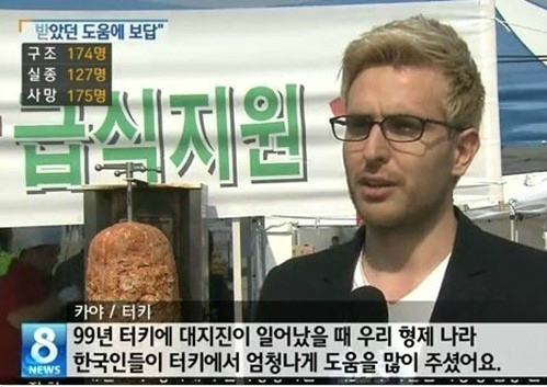 지난 24일 전남 진도 실내체육관 앞마당에서 터키인과 한국인으로 구성된 자원봉사단이 케밥 무료 지원 봉사를 펼쳤다. 이들은 세월호 사고로 인해 끼니를 제대로 챙기지 못하는 실종자 가족들과 자원봉사자들을 위해 1500인분의 케밥을 준비해 무료로 나눠졌다.