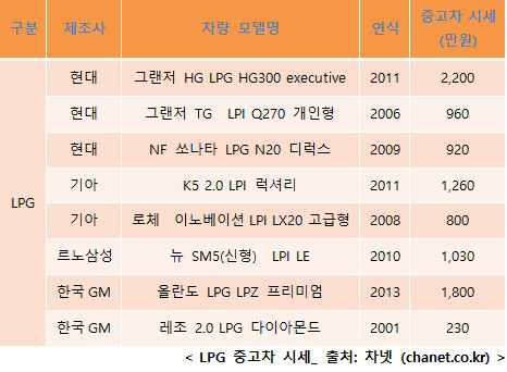 | ▶ 주요 LPG 차량 시세. /자료=차넷(www.chanet.co.kr) |