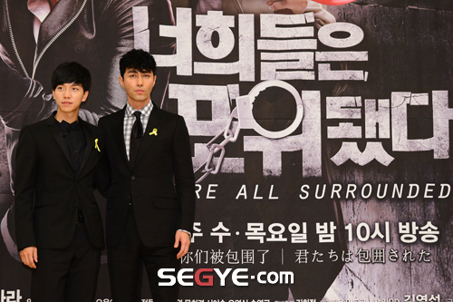 배우 이승기, 차승원이 30일 오후 서울 목동 SBS 사옥에서 열린 SBS 수목 드라마 '너희들은 포위됐다' 제작발표회에 참석해 포즈를 취하고 있다.