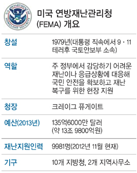 미국의 재난 구조 장치도 한때 제대로 작동하지 못해 여론의 혹독한 비판에 시달렸다. 2005년 8월 말 허리케인 ‘카트리나’가 미국 남부의 뉴올리언스 등을 강타해 1800여명이 사망했다. 미국 연방 정부는 물론 주 정부와 시 당국, 지자체 등은 우왕좌왕했다. 재난 대응 핵심 정부 기관인 연방재난관리청(FEMA) 역시 ‘이런 부처는 차라리 없애는 게 낫다’는 혹평을 받을 정도로 거대 재난 앞에 속수무책이었다. FEMA는 카터 정부에서 미 연방재난관리 시스템의 컨트롤타워로 1979년 설립됐다가 2001년 9·11테러 이후 국토안보부가 창설되면서 국토안보부 산하기관으로 편입됐다.