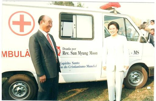 | 문선명·한학자 총재가 1996년 파라과이 판타날에 기증한 구급차 앞에 서 있다. |