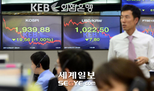 | 원·달러 환율이 5년9개월 만에 1020원대 진입한 7일 서울 중구 외환은행 본점 딜링룸에서 직원들이 분주한 모습을 보이고 있다. 이재문 기자 |