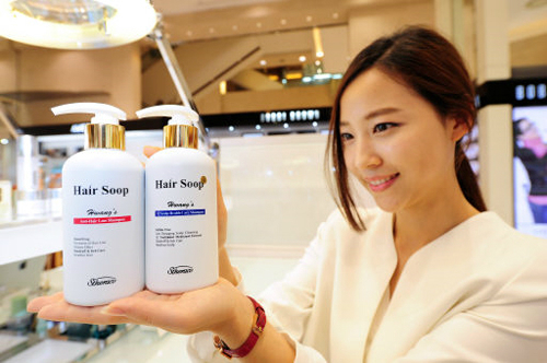 | 서울 동작구에 위치한 에스테라코 샵에서 모델이 탈모 관리 샴푸를 선보이고 있다. |