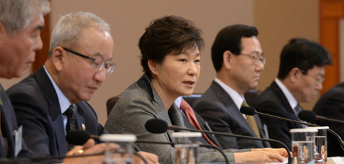 | 박근혜 대통령이 9일 오전 청와대에서 세월호 참사에 따른 경기위축 여파를 점검하고 대응책을 마련하기 위한 긴급 민생대책회의를 주재하고 있다. 회의에는 현오석 경제부총리(왼쪽 두 번째)와 민간 경제연구기관 관계자, 업체 대표 등이 참석했다. 청와대사진기자단 |