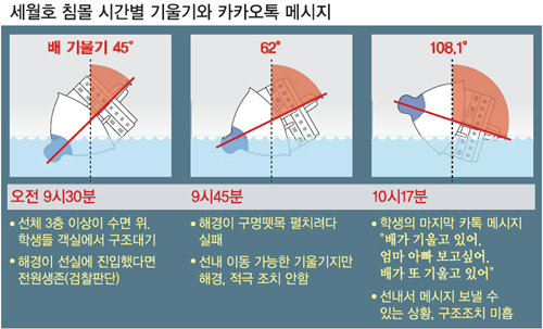 대검찰청 디지털포렌식센터(DFC)는 승객들이 사고 당시 전송한 모바일메신저 카카오톡 메시지 등을 토대로 세월호의 시간대별 경사도를 분석해 이 같은 결과를 11일 밝혔다.