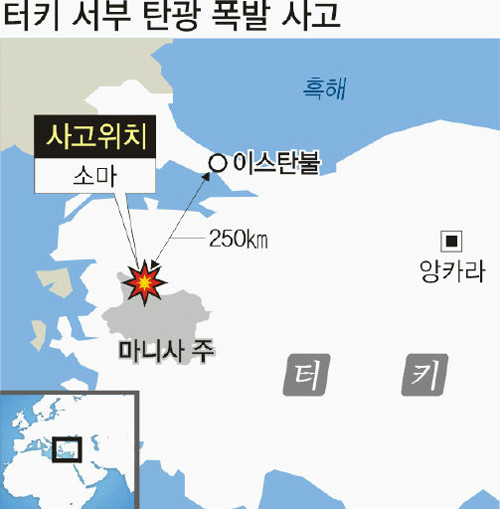앞서 전날 오후 3시20분쯤 이스탄불에서 남쪽으로 약 250㎞ 떨어진 마니사주 소마 탄광에서 폭발이 일어나 갱도가 붕괴하는 사고가 발생했다. 재난당국은 “폭발 당시 탄광 안에 787명이 작업하고 있었다”며 “주된 사망 원인은 일산화탄소 등 유독가스 때문”이라고 밝혔다.