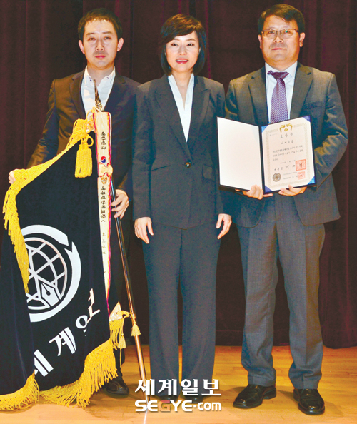| 15일 서울 종로구 정부서울청사 별관에서 열린 ‘2014 가정의달 기념 유공자 포상식’에서 대통령 표창을 받은 세계일보를 대표해 문준식 체육부장(오른쪽)과 안용성 산업부 기자(왼쪽)가 조윤선 여성가족부 장관과 기념촬영을 하고 있다. 남정탁 기자 |
