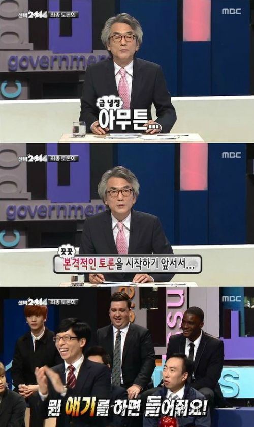 MBC ‘100분 토론’을 진행했고, 현재 CBS 라디오 '시사자키 정관용입니다' 사회를 맡은 시사평론가 정관용 교수가 무한도전에서 무게감과 예능감을 성공적으로 발산했다.