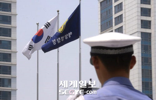 | 창설 60여년 만에… 세월호 구조업무 실패와 관련해 해경 해체가 결정된 19일 인천시 연수구 해양경찰청 본청 정문에 근무하는 의경이 바람에 날리는 태극기와 해경깃발을 바라보고 있다. 인천=이제원 기자 |