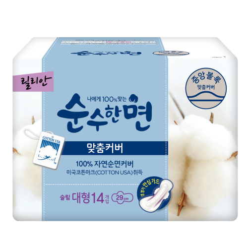 ‘순수한면 맞춤커버’는 몸에 꼭 맞는 입체 구조의 중앙볼록 맞춤커버를 적용한 것이 특징이다. 패드 길이를 늘이고 안심가드를 적용해 쾌적한 활동을 돕는다. 국내 최초로 미국 코튼 마크를 취득한 100% 자연 순면커버로 피부 자극이 적다. 포름알데히드, 형광물질, 염소표백제, 화학향료, 색소 등 유해성분을 넣지 않았다.