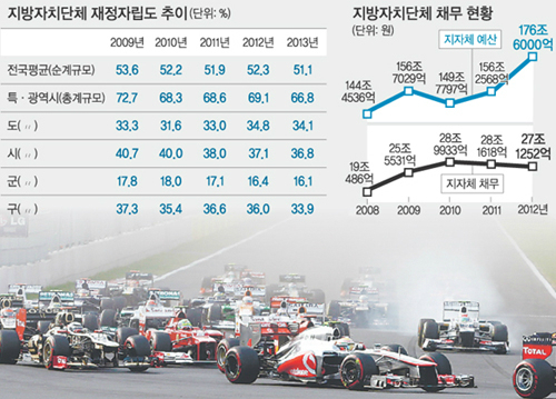 | 2012년 10월 14일 전남 영암 국제자동차경주장에서 열린 포뮬러원(F1) 그랑프리 결승전에서 레이싱 자동차들이 달리고 있다. F1과 같이 지방자치단체가 추진한 대규모 국제행사 등으로 지방재정이 악화하는 사례가 늘고 있다. 세계일보 자료사진 사진출처 |