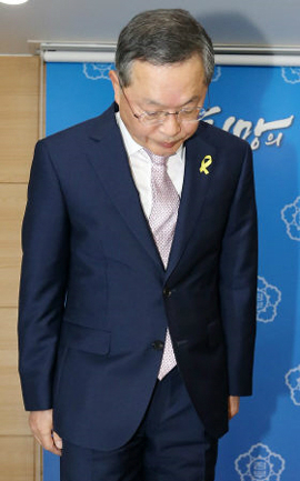 | 안대희 국무총리 후보자가 26일 오후 서울 종로구 정부서울청사에서 열린 기자회견에서 전관예우 논란을 빚은 변호사 활동 수익 전액을 환원하겠다는 입장을 발표한 뒤 고개를 숙여 인사하고 있다. 연합뉴스 |